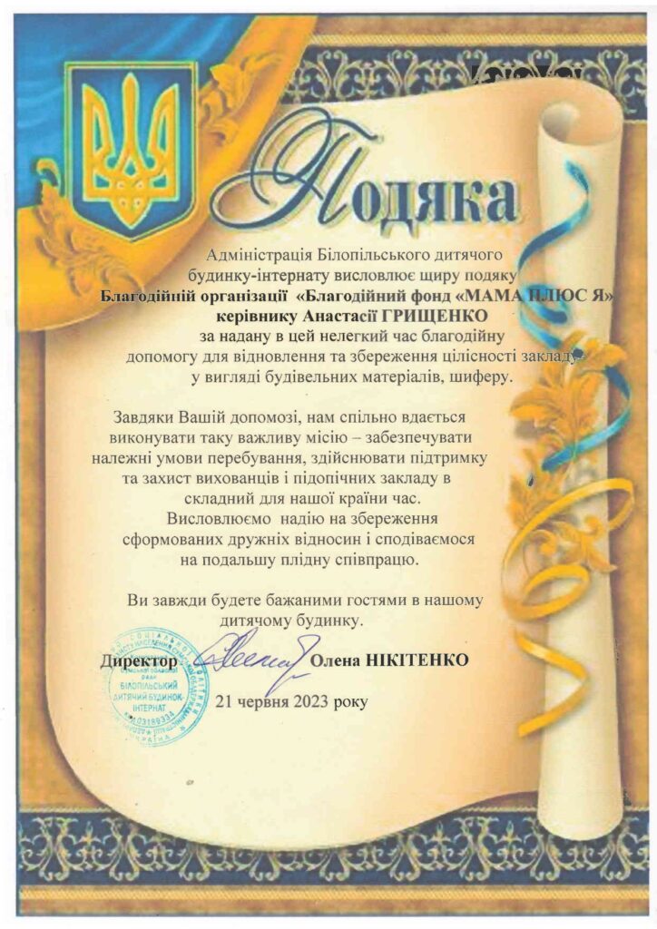 Подяка за допомогу у закупівлі шиферу для термінового ремонту даху
