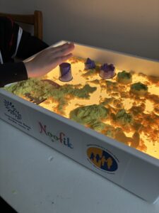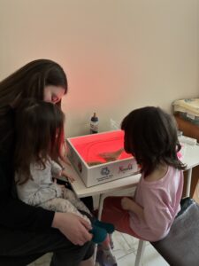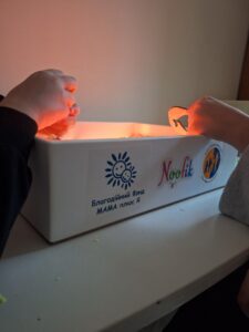 Тож тепер ми працюємо з інтерактивним світловим планшетом-пісочницю для дітей проєкту «Кімната Щастя».